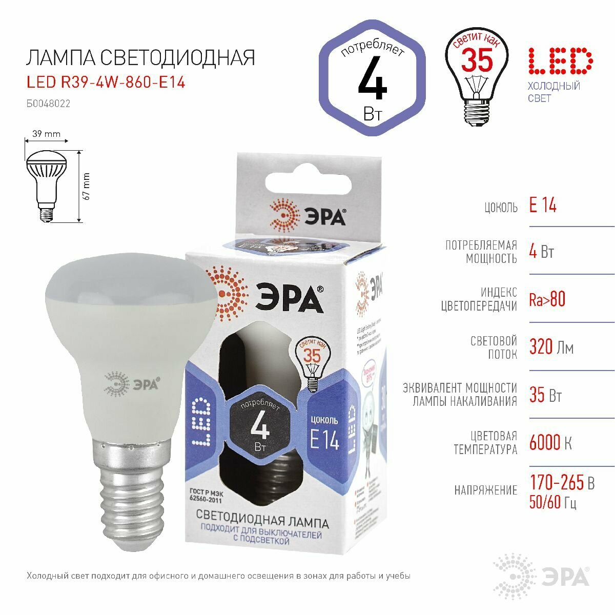 Купить ЭРА LED R39-4W-860-E14 ЭРА (диод, рефлектор, 4Вт, холод, E14), (10/100/5600)