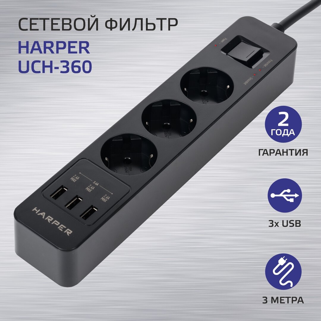 Сетевые фильтры HARPER UCH-360 Black 1279815
