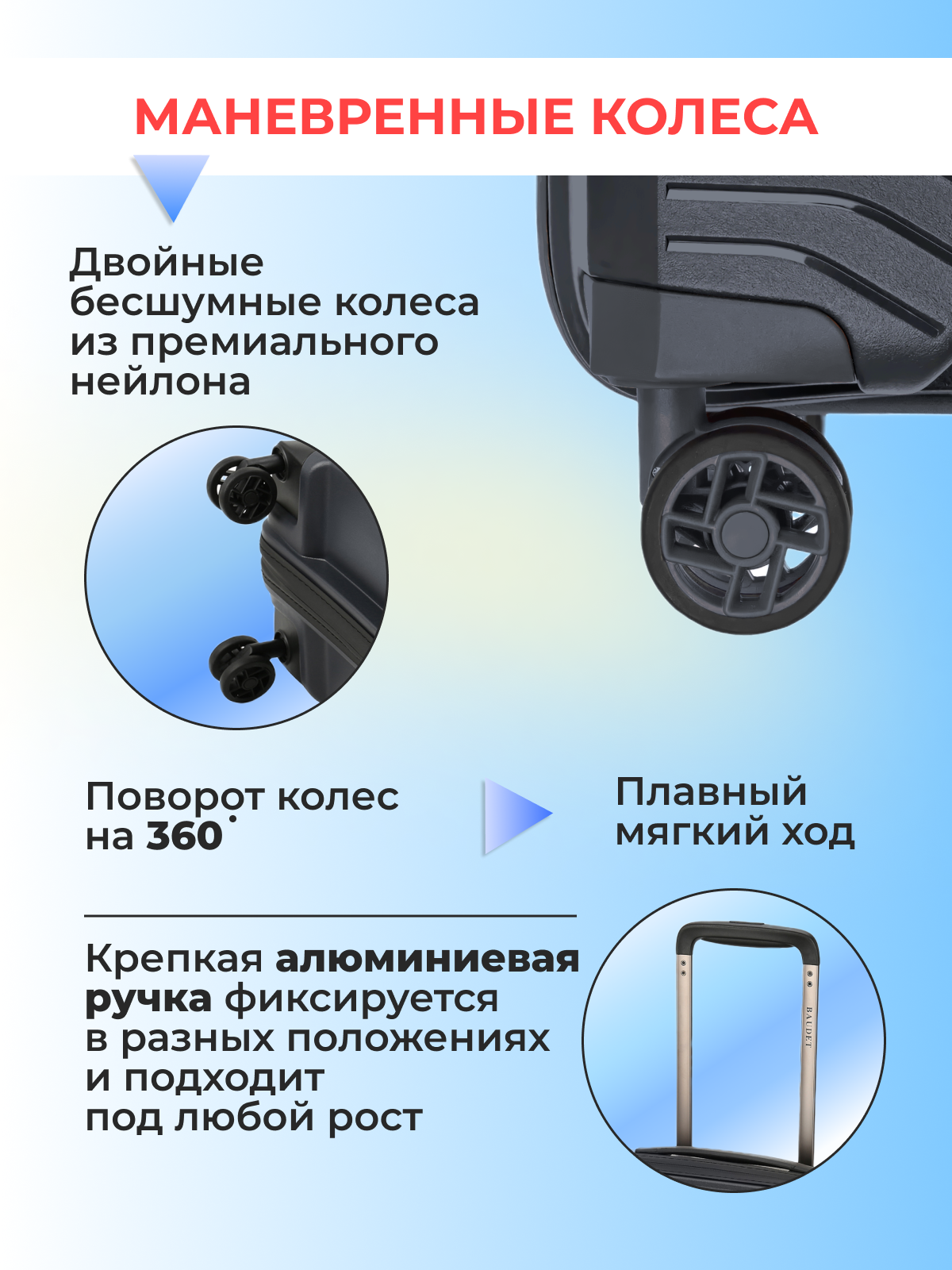 Чемодан на колесах BAUDET 812-67 (голубой/черный) M-средний, из полипропилена, 65,6 л