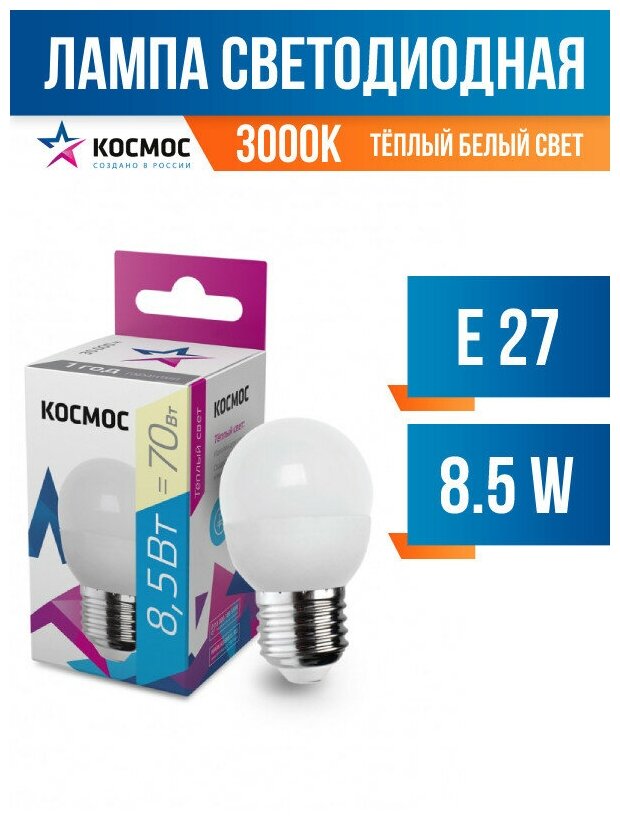 Светодиодная лампа Космос, 8.5 Вт, E27, 3000 K, шар, LED8.5wGL45E2730, теплый белый