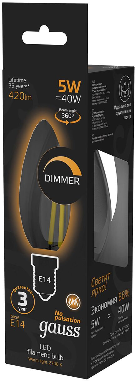 Лампа светодиодная Gauss 103801105-D Filament C37 E14 5W 2700К диммируемая
