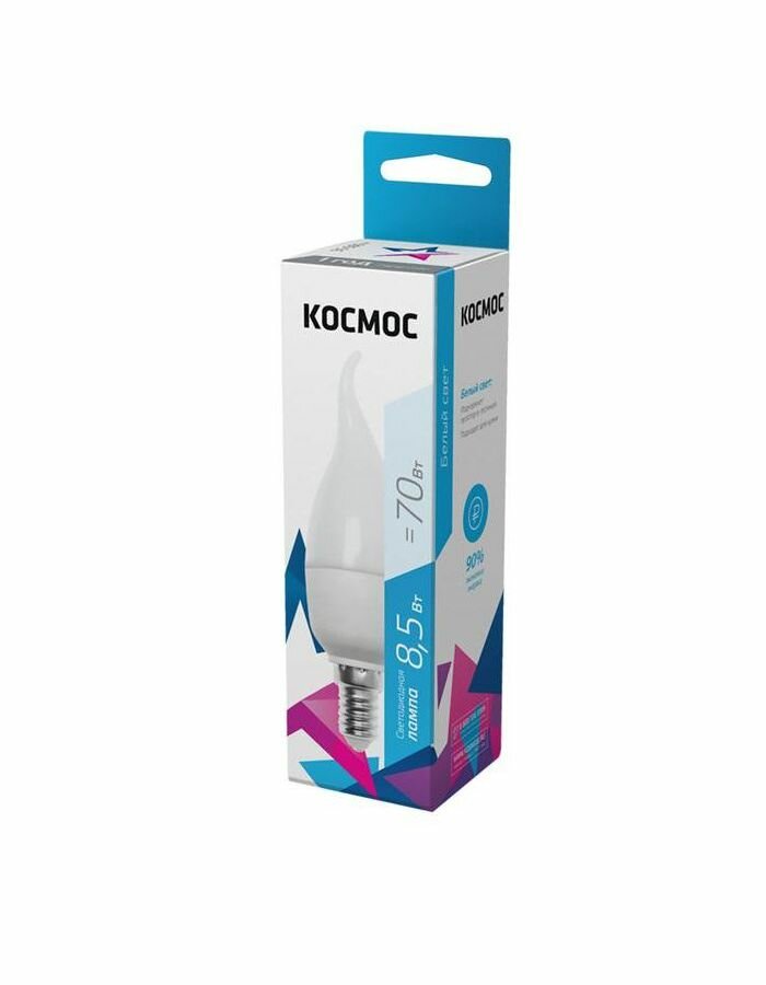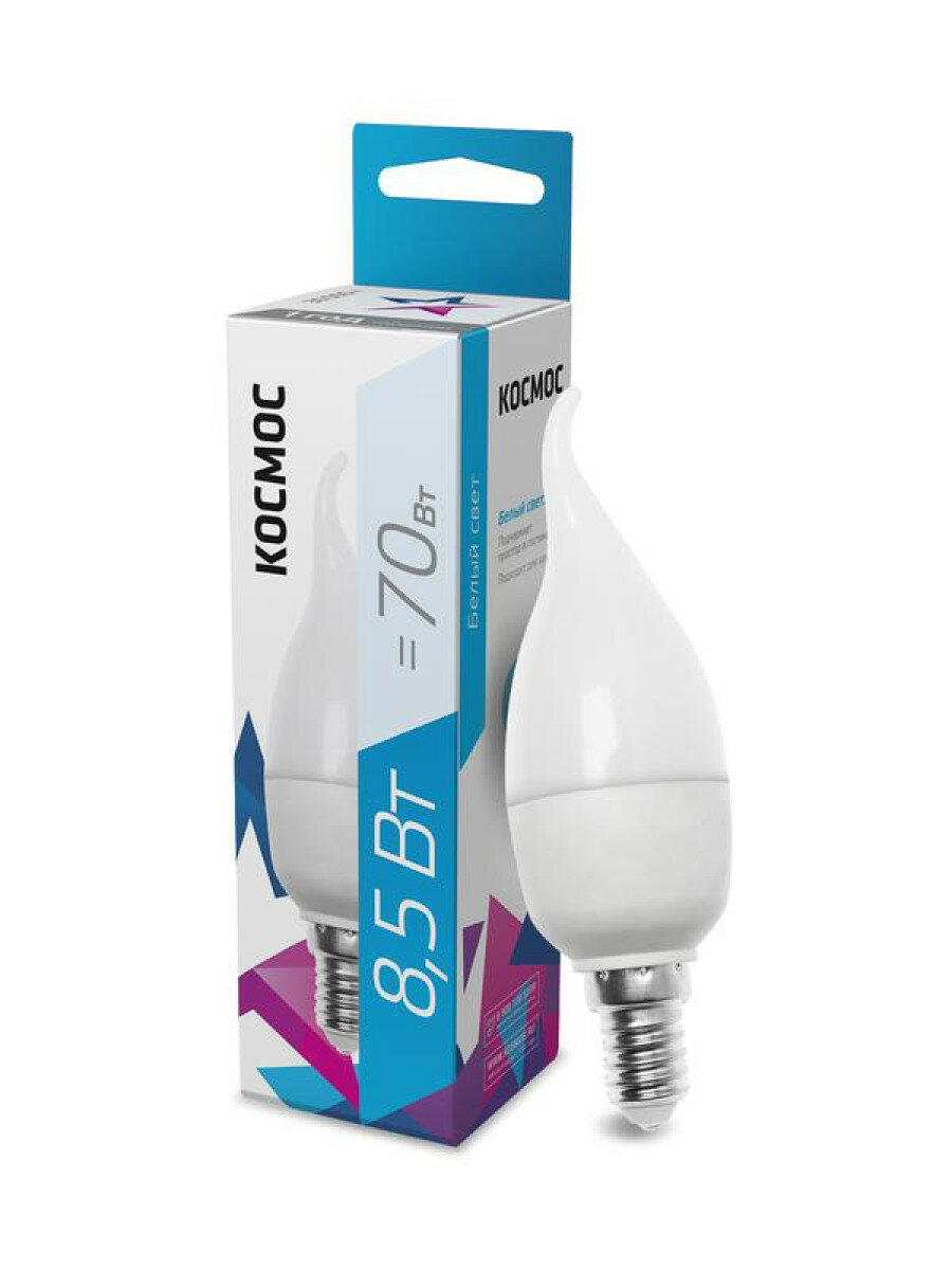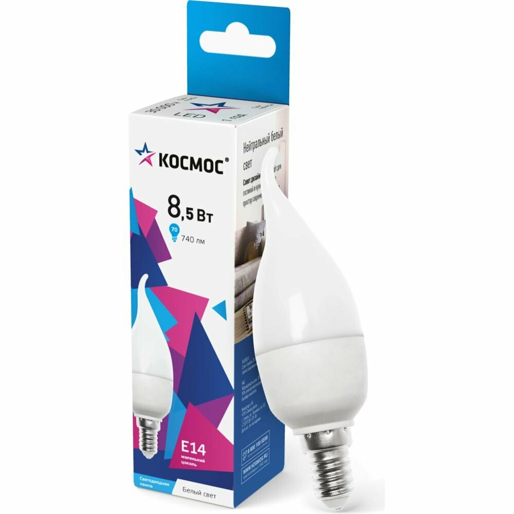 Светодиодная лампа Космос, 8.5 Вт, E14, 4500 K, свеча на ветру, LED8.5wCWE1445, нейтральный белый
