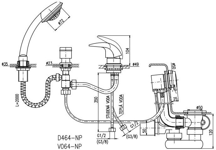 Смеситель для ванны RAV Slezak Dunaj на 3 отверстия, наполнение через сифон, хром D464.5/NP2/570