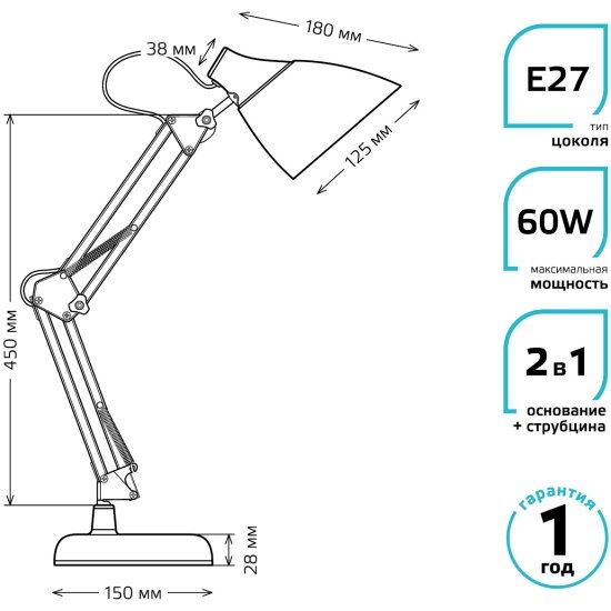 Лампа офисная gauss GTL003, E27, 60 Вт, черный