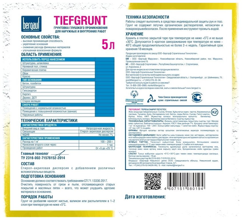 Бергауф ТифГрунт грунтовка глубокого проникновения (5л) / BERGAUF TiefGrunt грунтовка глубокого проникновения для наружных и внутренних работ (5л)