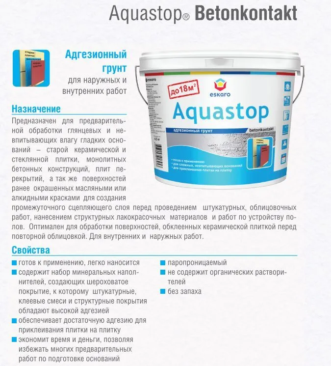 СохранитьГрунт адгезионный для невпитывающих поверхностей "Eskaro Aquastop CONTACT" 1,5кг интересное:
