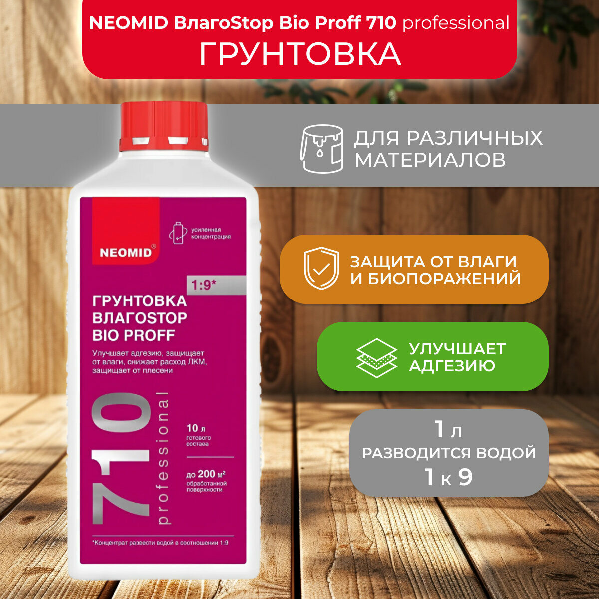 Грунт-Влагоизолятор Neomid 710 ВлагоStop BIO Proff 1л Концентрат (1:9) / Неомид 710.