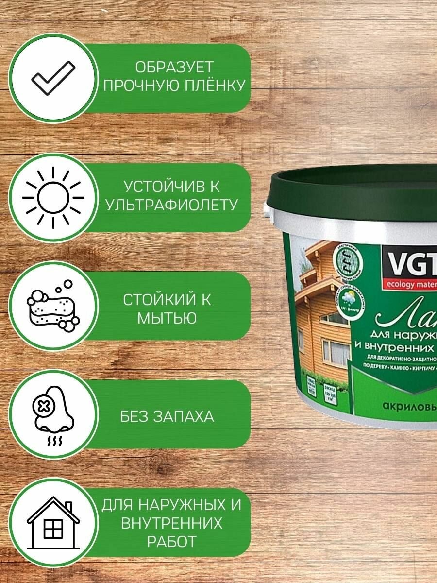 ВГТ лак акриловый для наружных и внутренних работ глянцевый (0,9кг) / VGT лак акриловый для наружных и внутренних работ по дереву кирпичу штукатурке г