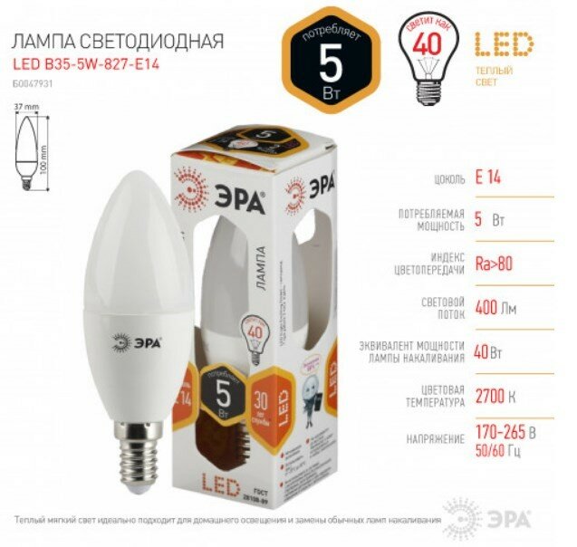 Светодиодная LED лампа ЭРА стандарт свеча C35 E14 5W 2700K 2K B35-5w-827-E14 8855 (упаковка 10 штук) интересное: