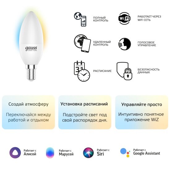 Умная Wi-Fi лампочка Gauss Smart Home С37 5W 470лм E14, управление голосом/смартфоном, с изменением темпрературы, диммируемая