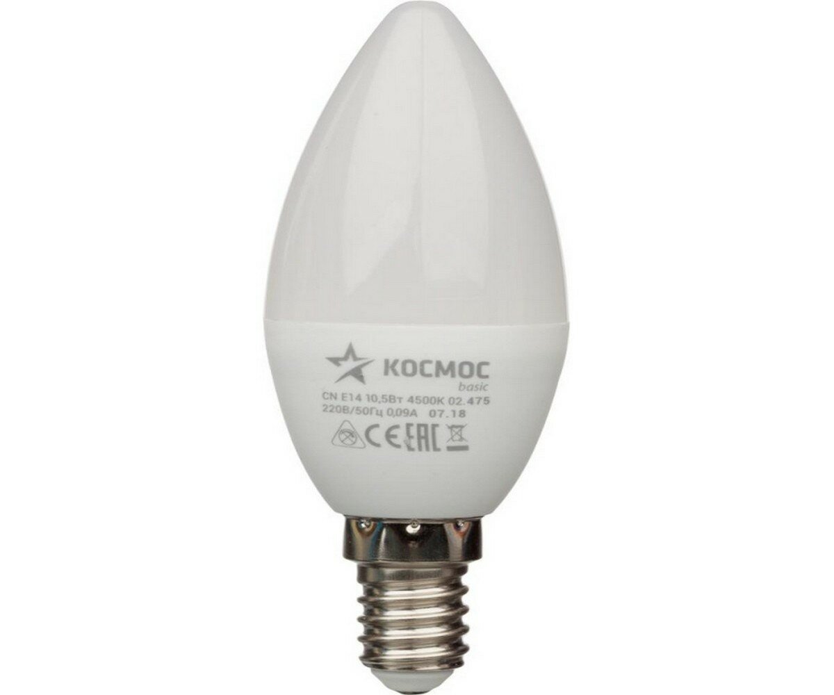 Светодиодная лампа Космос, 10.5 Вт, E14, 4500 K, свеча, LED10.5wCNE1445, нейтральный белый