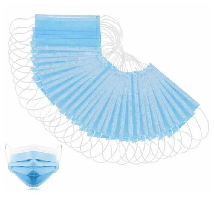 Одноразовые маски трёхслойные, 100 шт., голубые (гигиенические маски медицинские из нетканного материала)