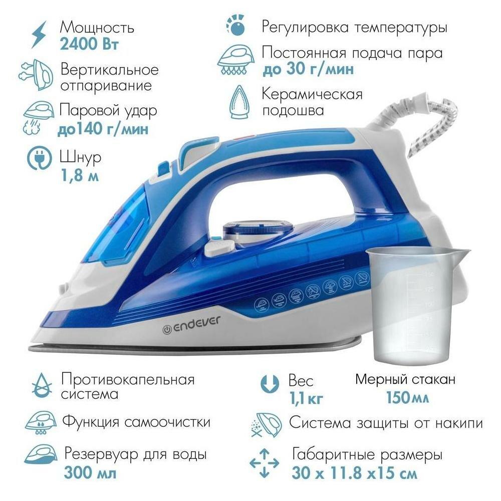 Утюг для одежды ENDEVER DELTA-219 / сухой и влажный режим глажения / вертикальное отпаривание / самоочищение / противокапельная система