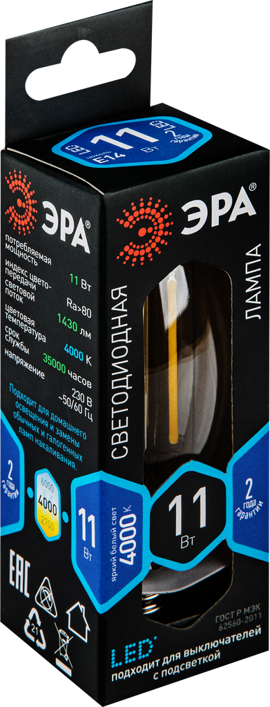 Купить ЭРА F-LED B35-11w-840-E14 (филамент, свеча, 11Вт, нейтр, E14)