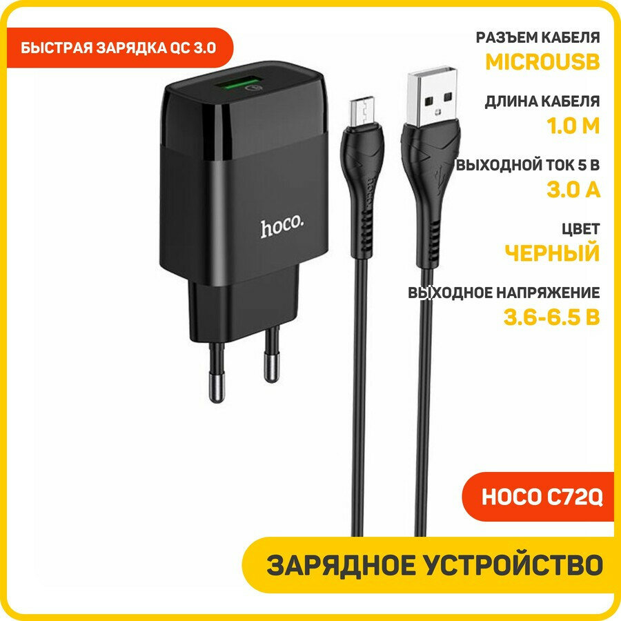 Сетевое зарядное устройство (СЗУ) Hoco C72Q (USB) + кабель MicroUSB, 3 А, черный