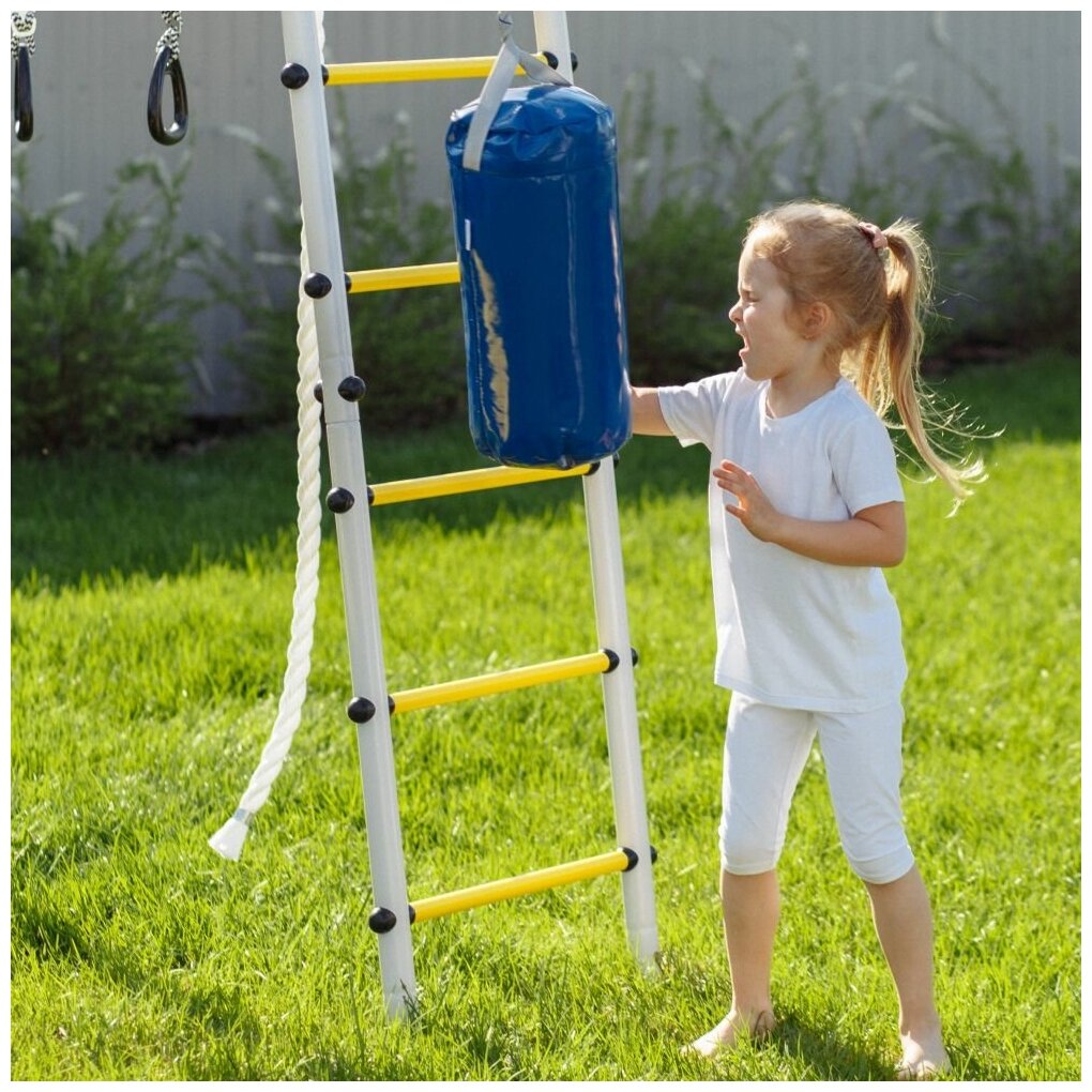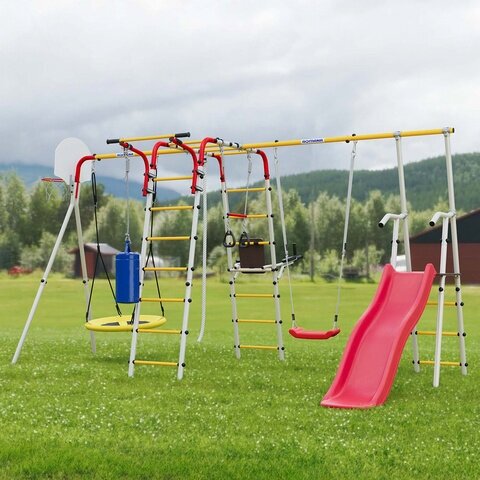 | В комплекте | баскетбольное кольцо, боксерская груша, гимнастические кольца, горка, канат, качели, рукоход, трапеция с кольцами, турник |