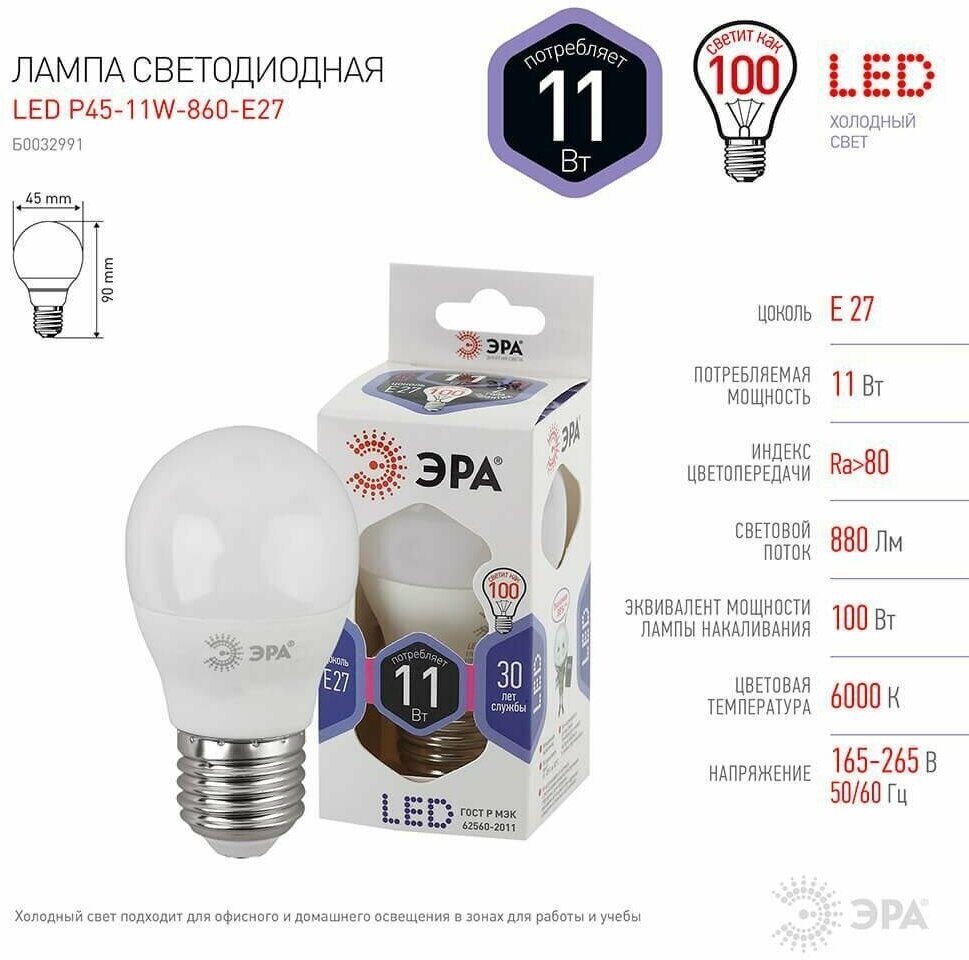 Упаковка светодиодных ламп ЭРА Б0032991, E27, P45, 11 Вт, 6000 К