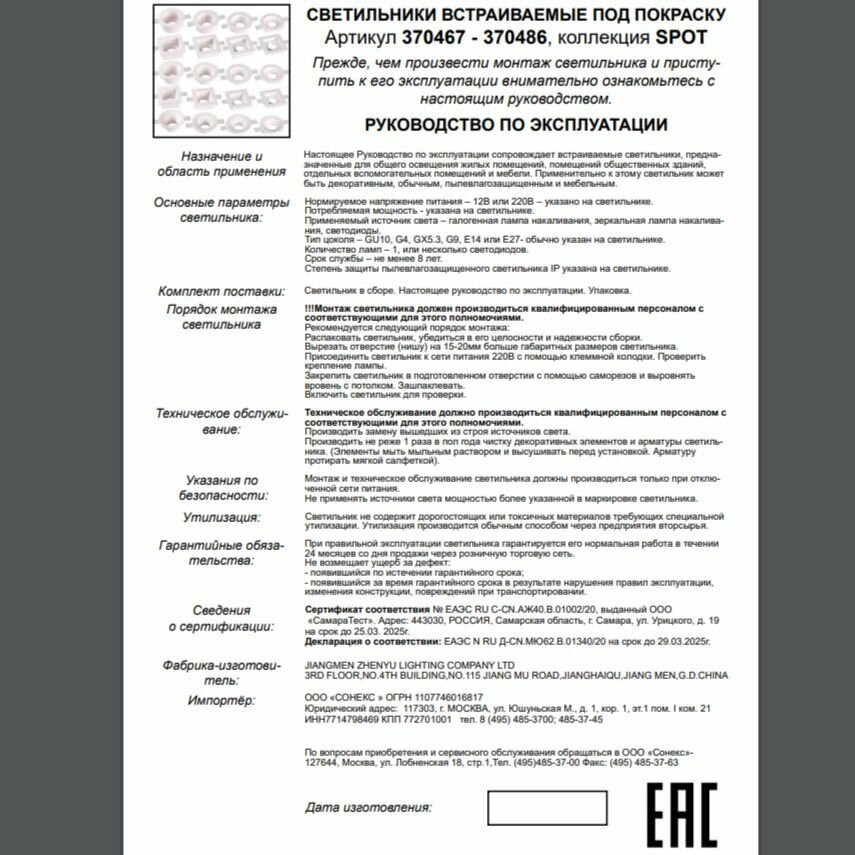 | Дополнительная информация | RU C-CN.АЖ40.В.01002/20, направленный свет, подходит для натяжных потолков, способ крепления - встраиваемый на саморезы |
