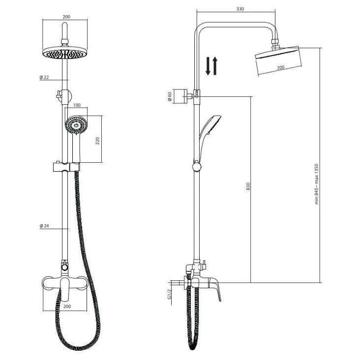 | Дополнительная информация | высота стойки для душа: 1450 мм; диаметр душевой лейки: 100 мм; диаметр верхнего душа: 200 мм |