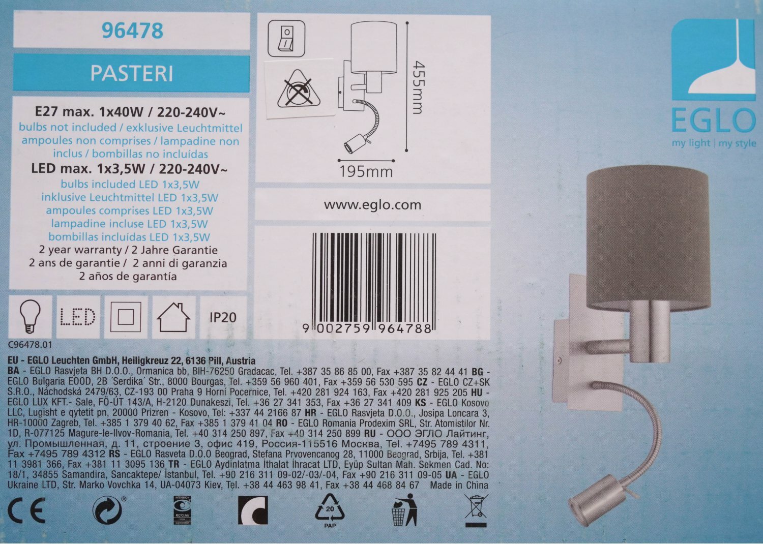 96478 Бра EGLO Pasteri интересное: