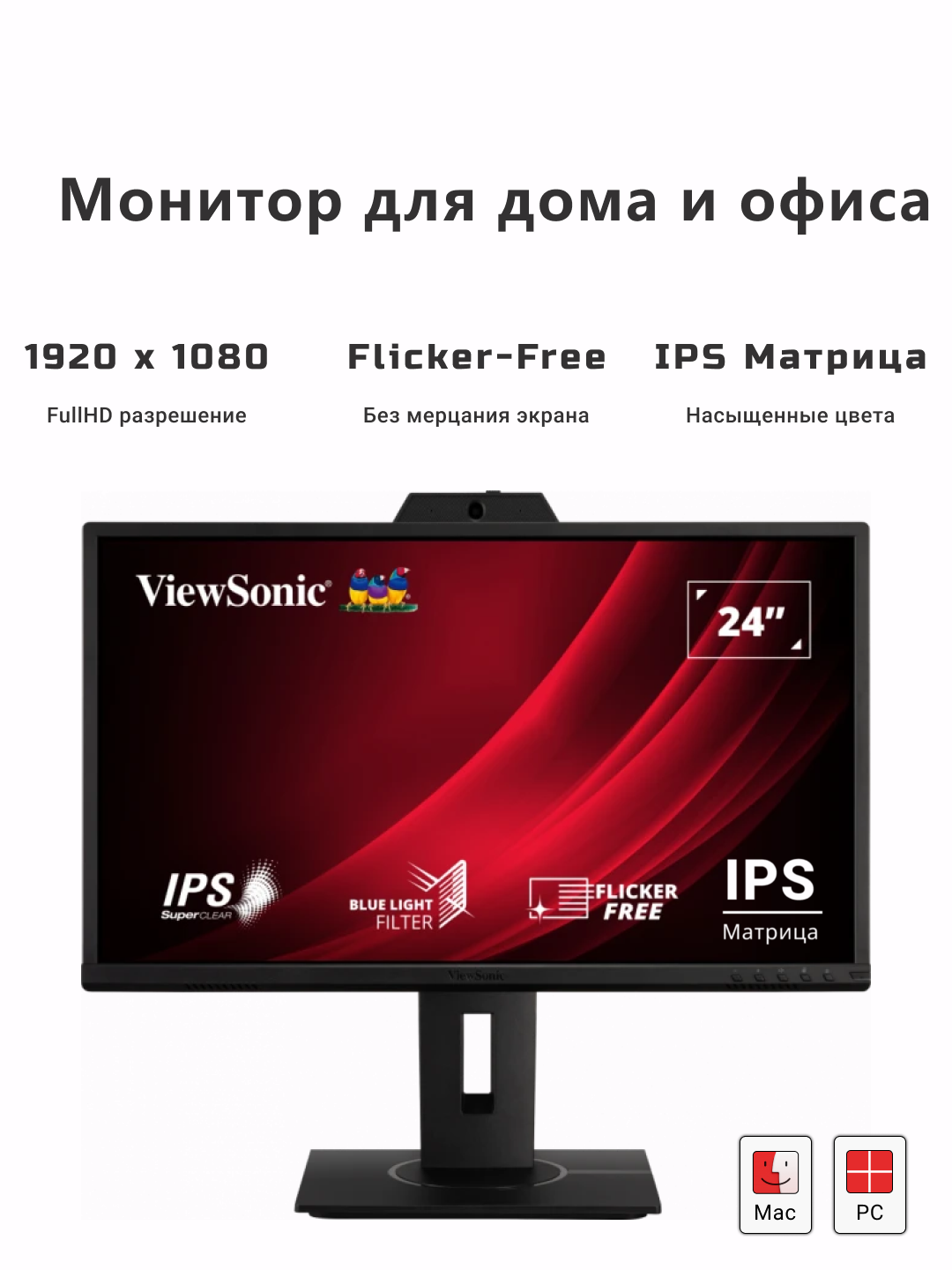 24" Монитор для дома и офиса с Web-камерой ViewSonic VG2440V IPS экран Full HD