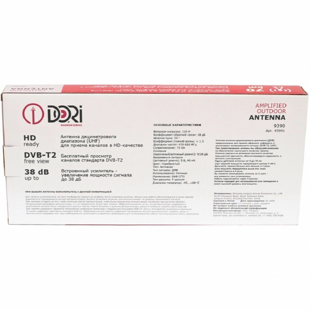 Антенна Dori 9390, уличная, активная, 38 дБ, DVB-T, DVB-T2, цифровая, с училителем