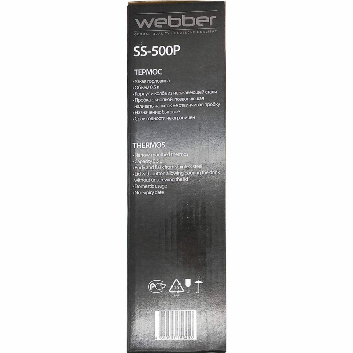 Термос Webber / Веббер SS- 500P с узким горлом пробка с кнопкой нержавеющая сталь 0.5л / термопосуда