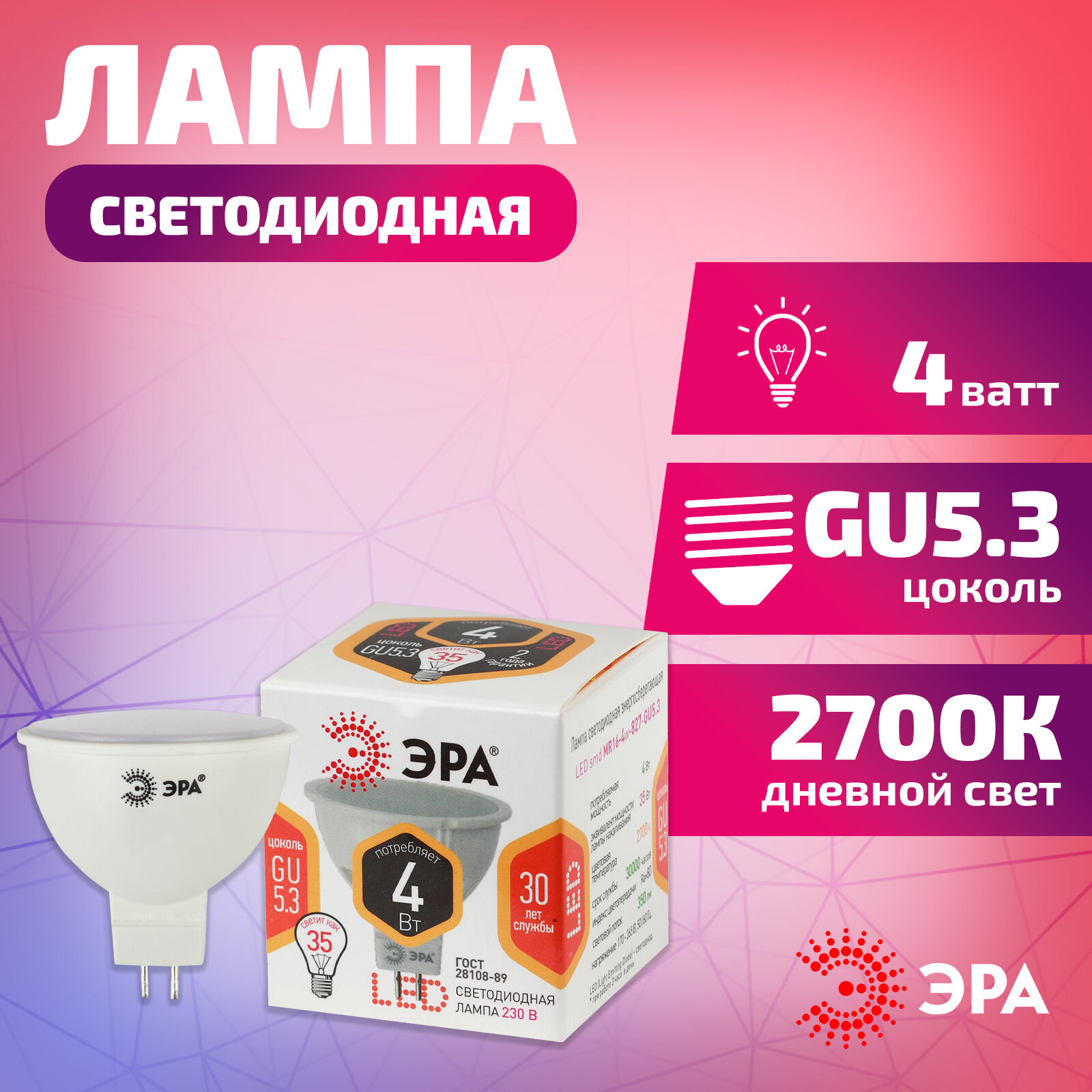 ЭРА LED MR16-4W-827-GU5.3 ЭРА (диод, софит, 4Вт, тепл, GU5.3), (10/100/3600)