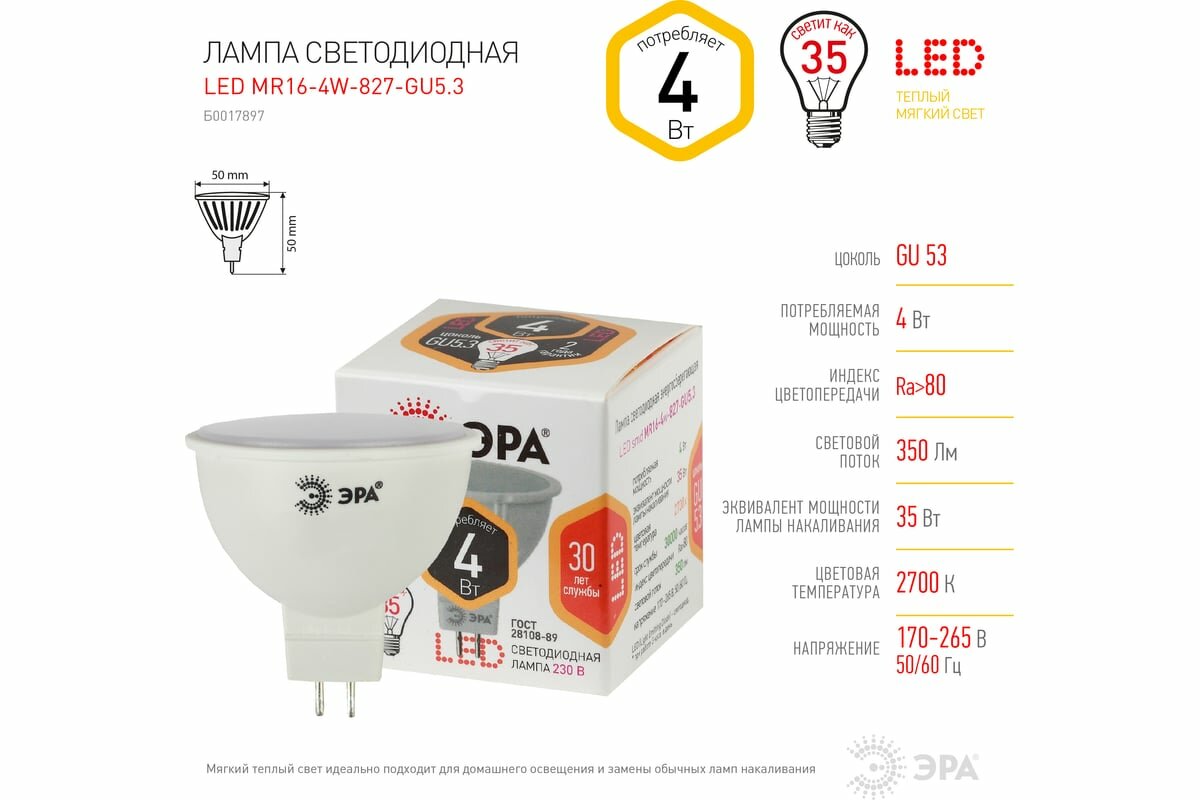 Ниже Вы можете прочитать отзывы на Лампа светодиодная ЭРА Standart Б0017897, GU5.3, MR16, 4 Вт, 2700 К, ознакомится с подробными характеристиками, посмотреть интересные обзоры и фотографии на Лампа светодиодная ЭРА Standart Б0017897, GU5.3, MR16, 4 Вт, 2700 К.