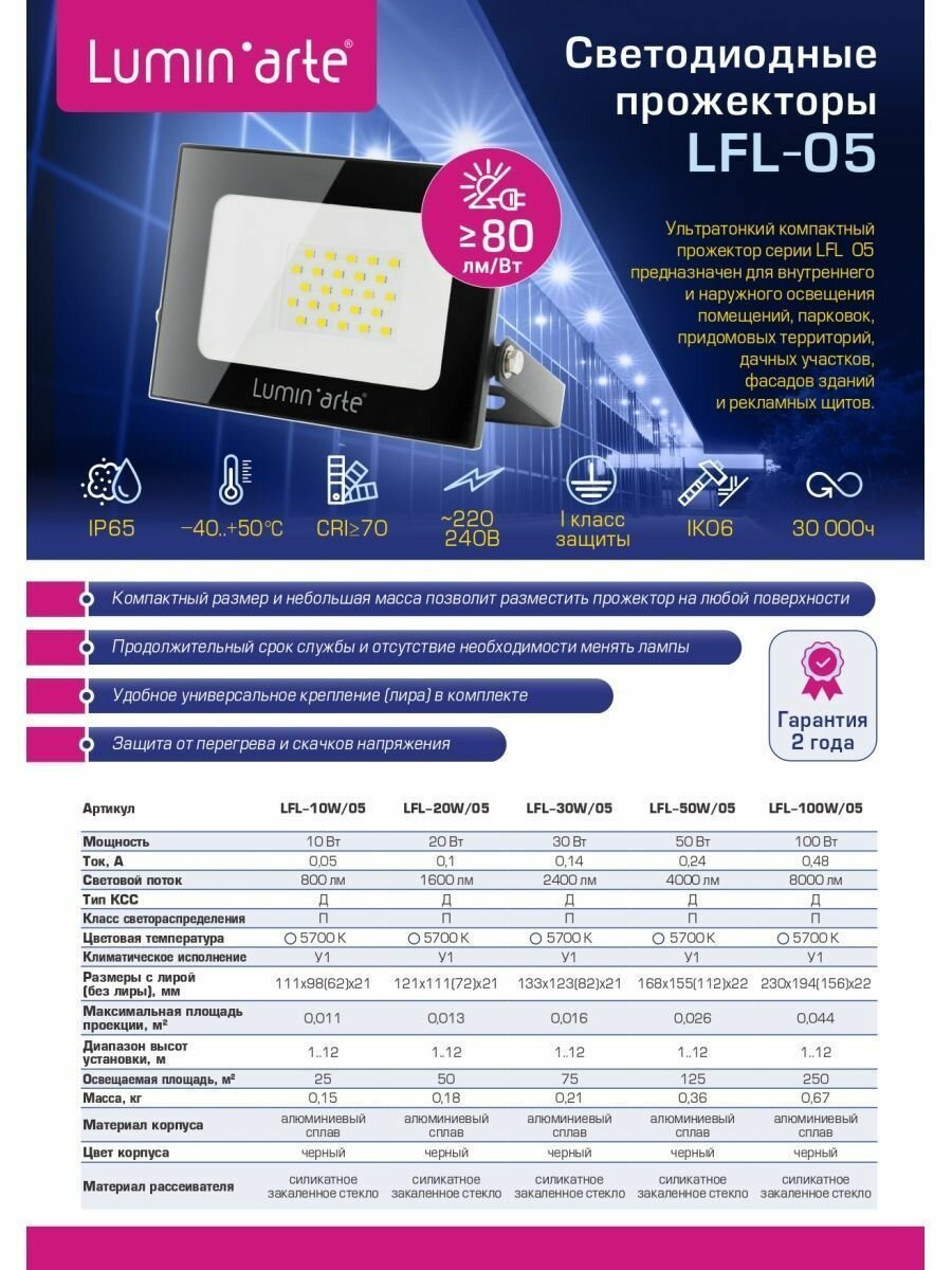 Lumin'arte Светодиодный прожектор LED 20Вт , 5700K Холодный белый свет , 800 лм черный , IP65 , LFL-20W/05