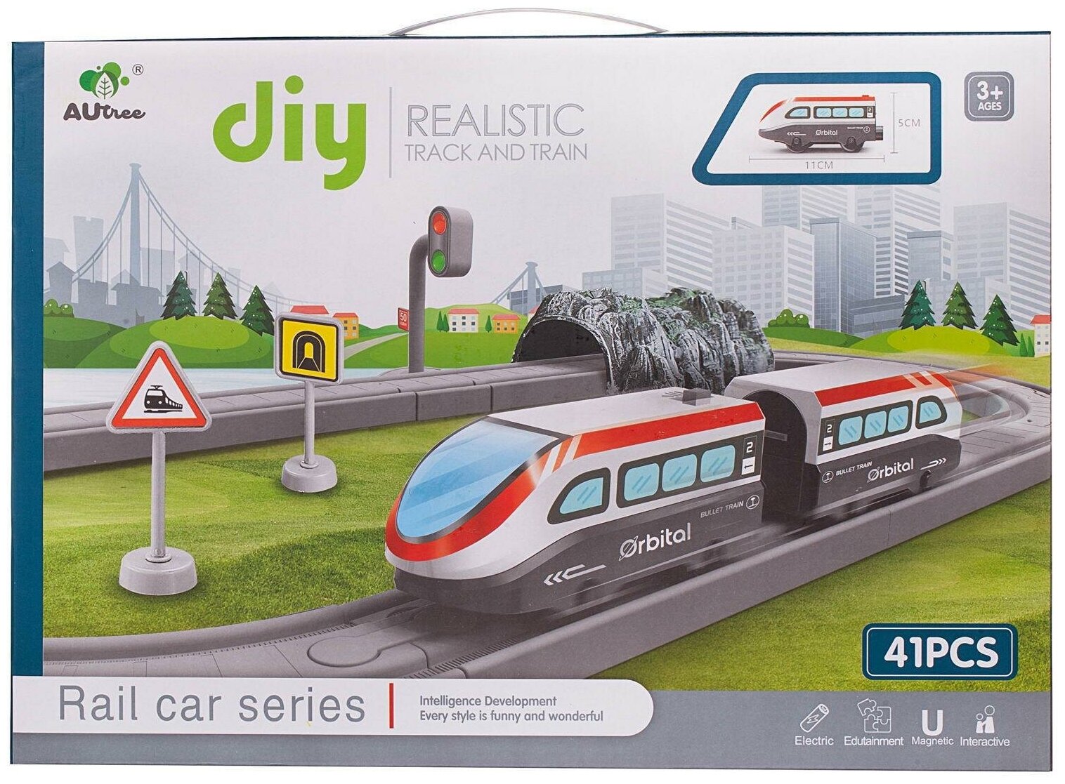 | Подробная комплектация | 2 вагона-локомотива, 13 рельс разной формы, семафор – 2 детали, соединительные детали - 14 шт., дорожные знаки – 6шт., туннель, 2 дерева, лист с наклейками |