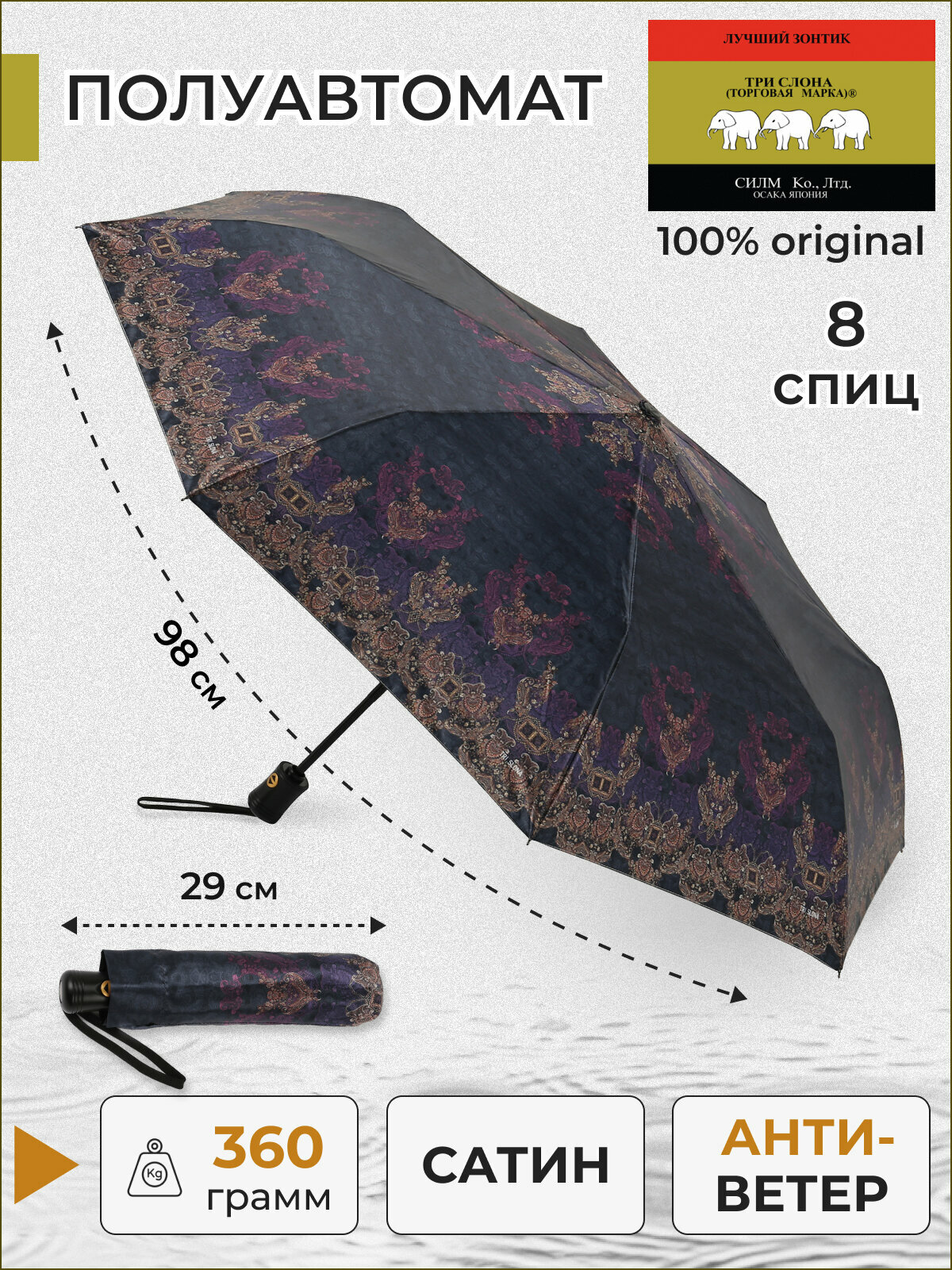 Зонт женский ТРИ слона, 3 сложения полуавтомат, черный, коричневый, красный