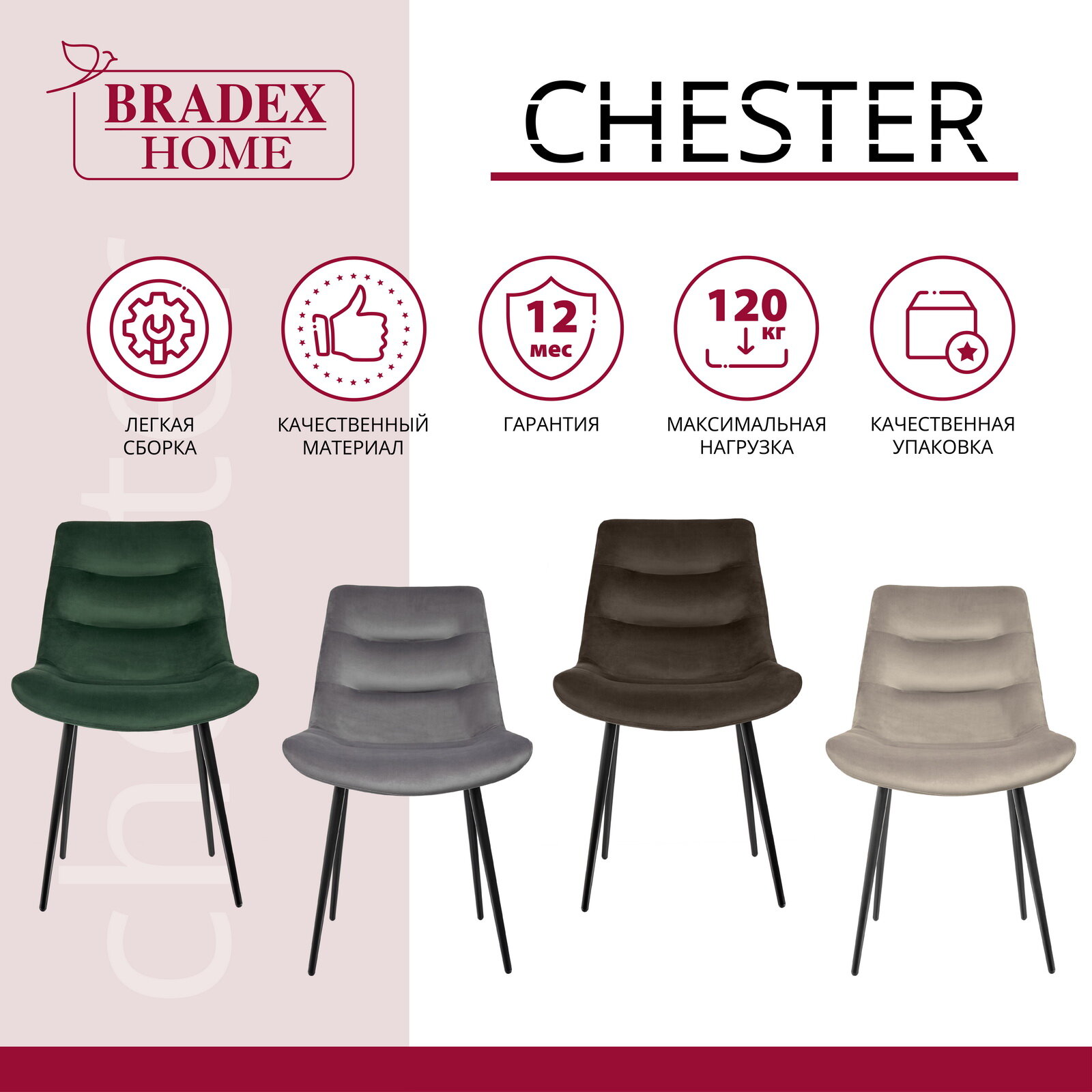 Стул BRADEXHOME Chester Темно-серый (велюр) Размеры: Высота 820мм Глубина 545мм Ширина 500мм
