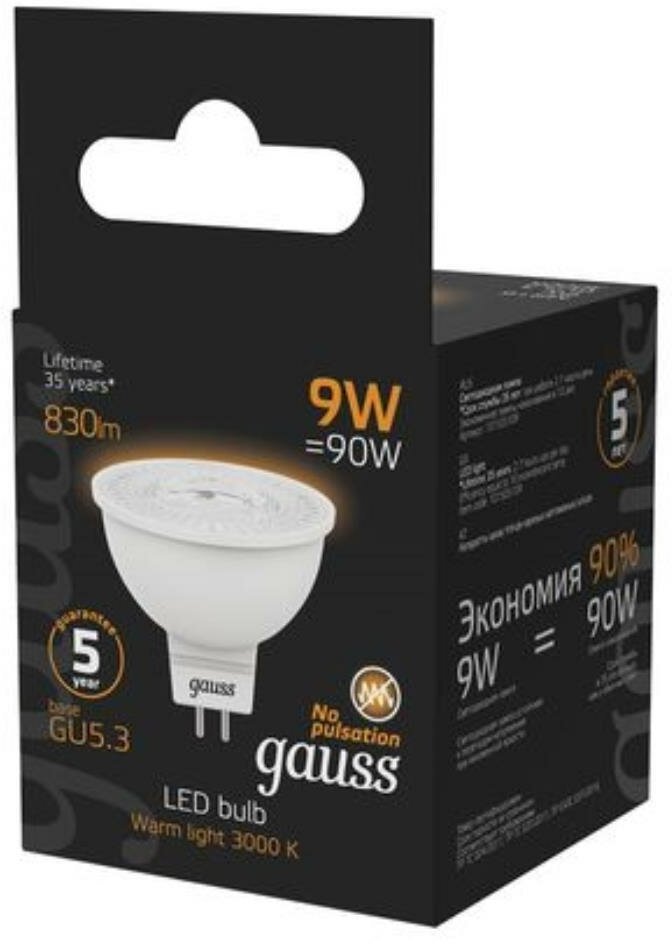 Лампа светодиодная Gauss 101505109 9Вт цок.:GU5.3 рефлек. 150B 3000K св.свеч.бел.теп. MR16 (упак.:1шт)