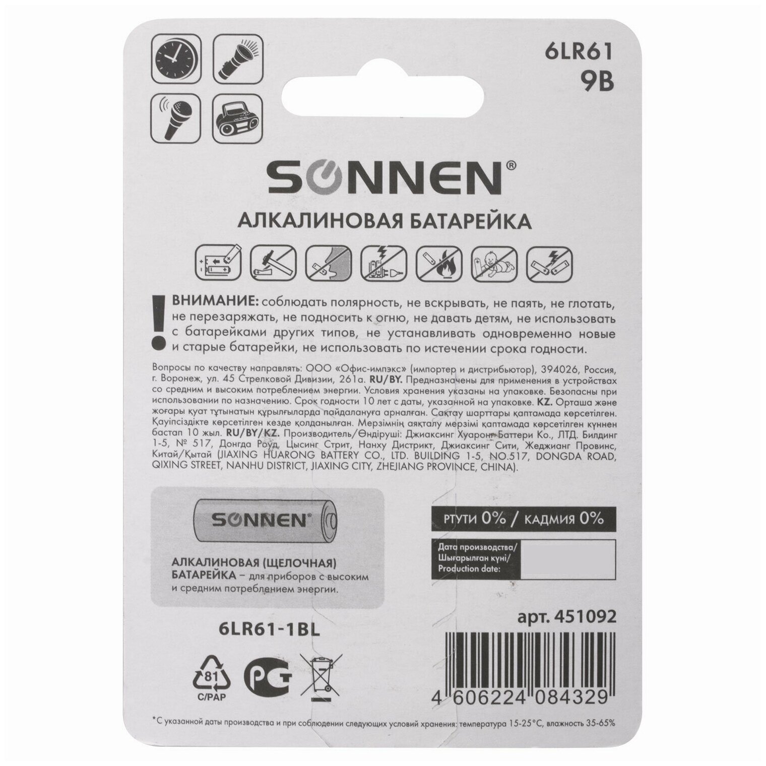 Батарейка Крона алкалиновая SONNEN Alkaline, (6LR61, 6LF22, 1604A), 1 шт, блистер, 451092