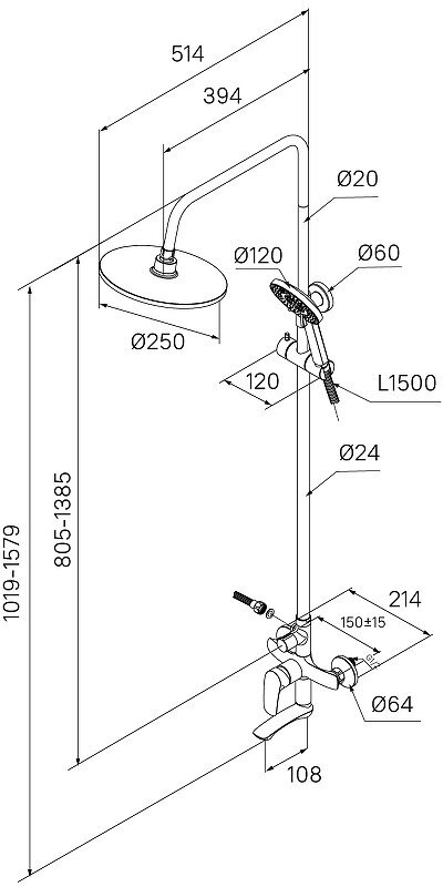 Душевая система Milardo Rora с верхним душем d250 мм с лейкой d120 мм со смесителем (RORWT4FM06)