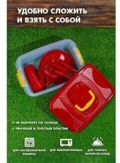| Дополнительная информация | для пикника; подробная комплектация: Контейнер 8л - 1шт. Тарелка большая 1л - 2шт. Тарелка средняя 0,48л - 4шт. Стопка 100мл - 4шт. Кружка 400мл - 4шт. Вилка - 4шт. Нож - 4шт. |