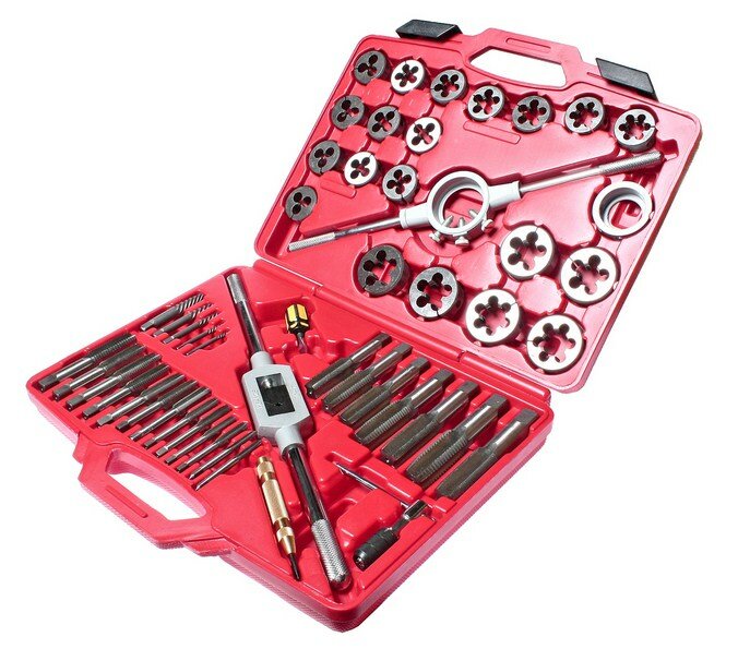 | Подробная комплектация | - 20 метчиков: M6x0.75, M6x1.0, M8x1.0, M8x1.25, M10x1.25, M10x1.5, M12x1.25, M12x1.5, M14x1.5, M14x2.0, M16x1.5, M16x2.0, M18x1.5, M18x2.5, M20x1.5, M20x2.5, M22x1.5, M22x2.5, M24x1.5, M24x3.0; - 14 плашек ⌀1-1/2": M6x0.75, M6x1.0, M8x1.0, M8x1.25, M10x1.25, M10x1.5, M12x1.25, M12x1.5, M14x1.5, M14x2.0, M16x1.5, M16x3.0, M18x1.5, M18x2.5; - 6 плашек ⌀2": M20x1.5, M20x2.5, M22x1.5, M22x2.5, M24x1.5, M24x3.0; - 5 экстракторов (№№ 1-5); - кернер; - ключ для метчиков Т-образный; - метчикодержатель; - плашкодеражатель; - адаптер; - отвертка; - кейс. |