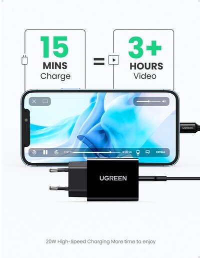 Набор адаптер и кабель USB-C - Lightning UGREEN CD137 (50799) PD Fast Charger 20W + USB-C to Lightning Cable EU. Длина 1 м. Цвет: черный