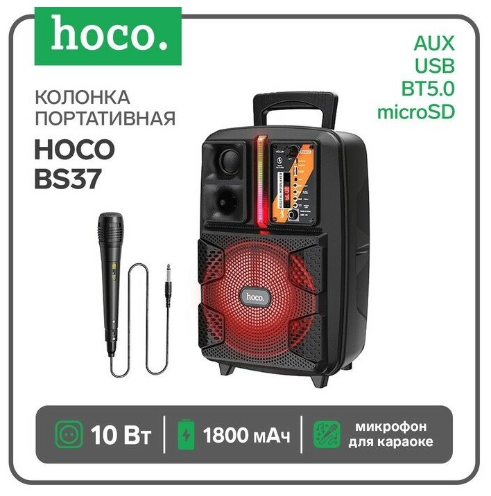 Hoco Портативная колонка Hoco BS37, 10 Вт, 1800 мАч, BT5.0, microSD, USB,AUX,FM, микрофон, черная