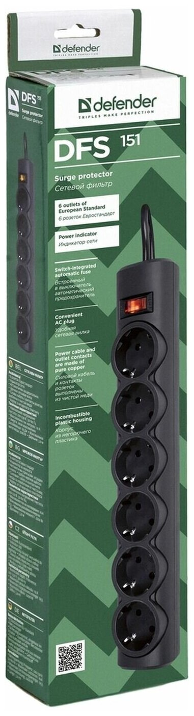 Купить Сетевой фильтр Defender DFS 151 1,8 м, черный, 6 розеток