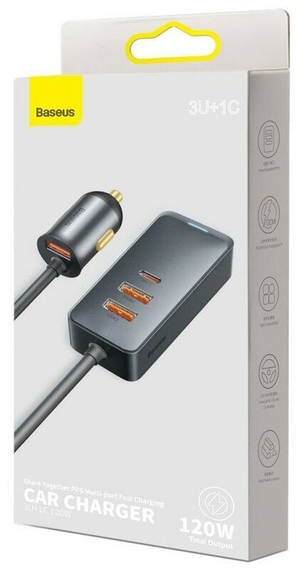 Автомобильное зарядное устройство BASEUS Share Together, 1xUSB с разветвителем 2xUSB + 1xUSB-C, 5A, 120W, серый