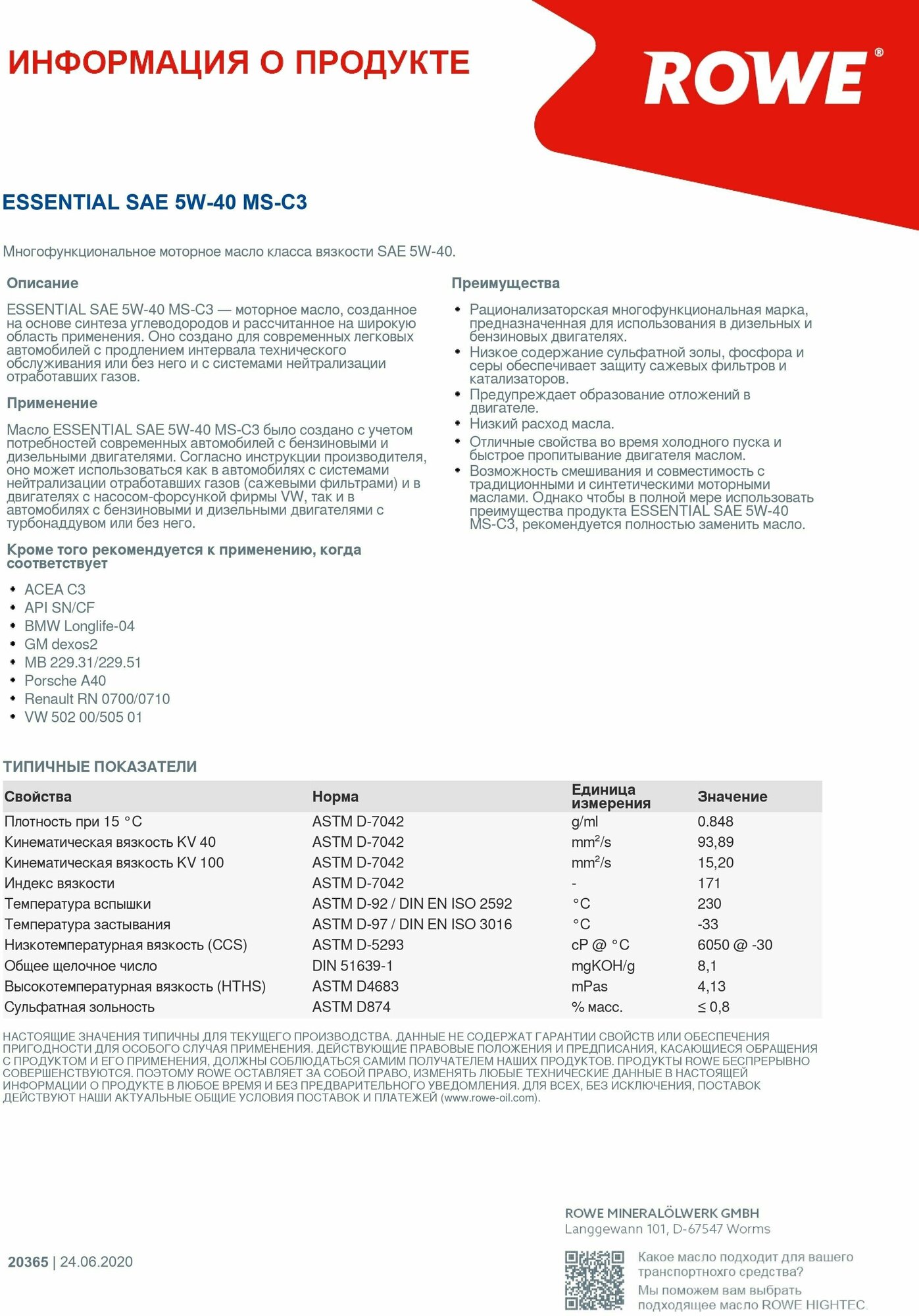 ROWE 20365-453-2A Масло ROWE 5W40 ESSENTIAL MS-C3 API SN/CF ACEA C3 4л син