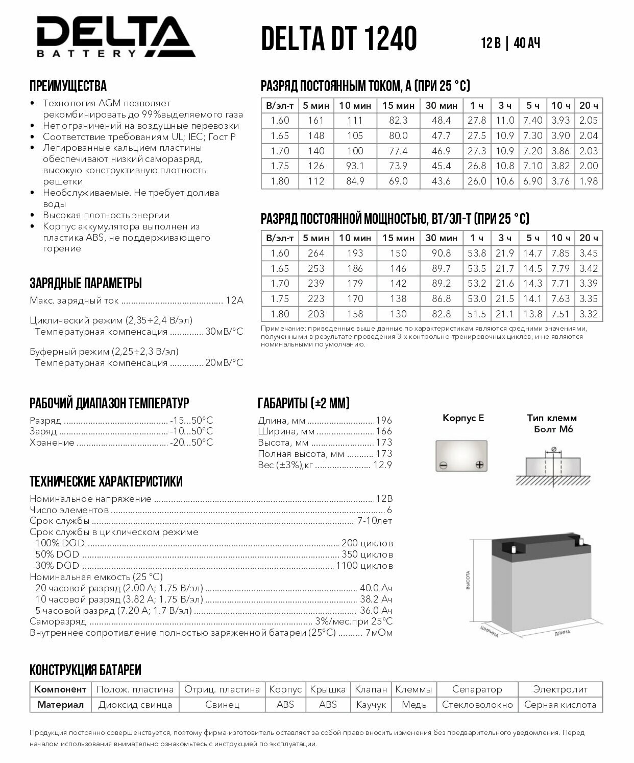 батареи Delta DT 1240 (40 А\ч, 12В) свинцово- кислотный аккумулятор