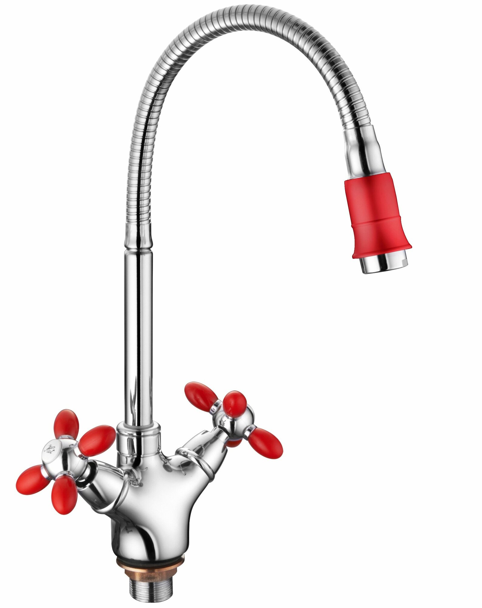 Смеситель кухня с гибким изливом на гайке (крест красный). Силумин, Accoona A4882N