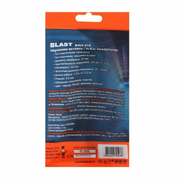 Blast Наушники Blast BAH-210, вакуумные, 3.5 мм, 1.2 м, красный
