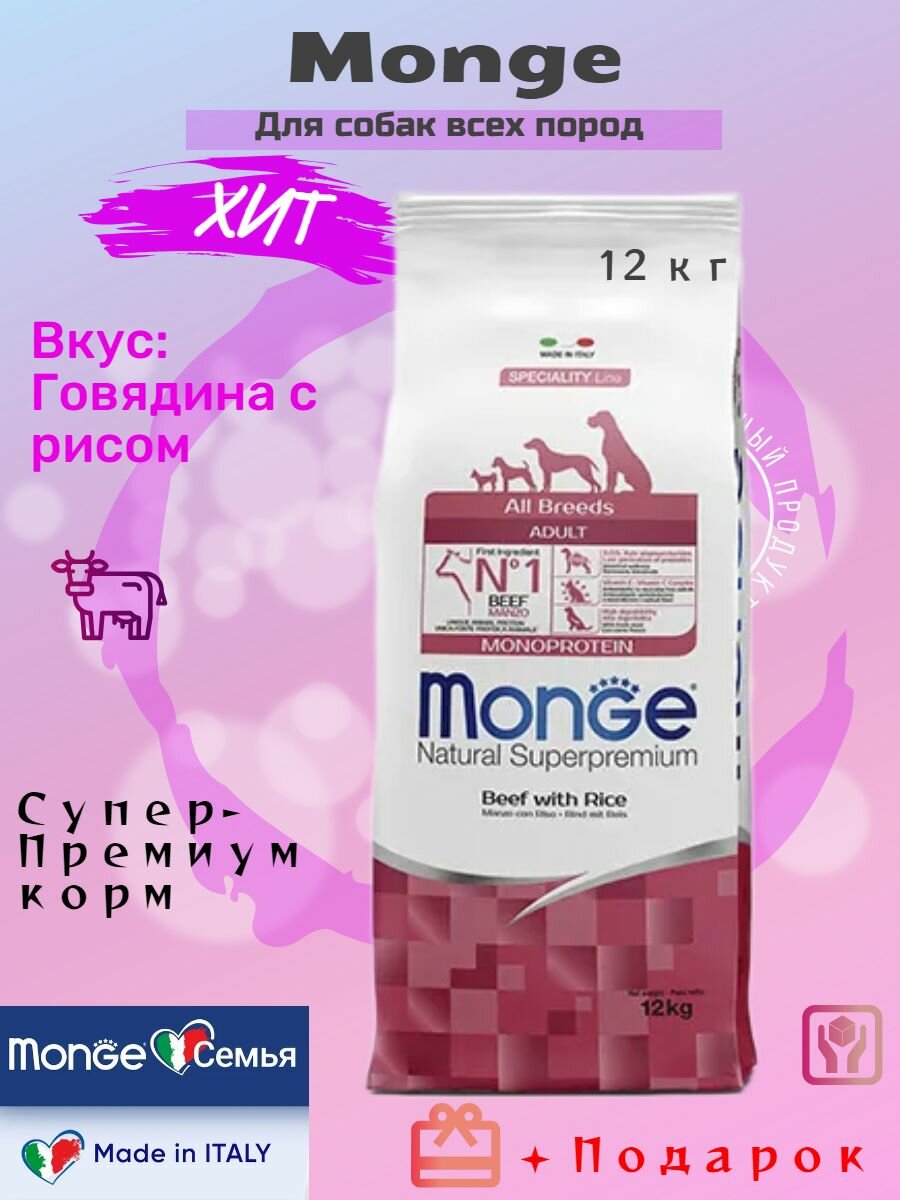 Сухой корм для собак Monge Speciality line all breeds adult monoprotein beef&rice, с говядина, с рисом, 12 кг