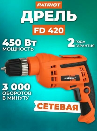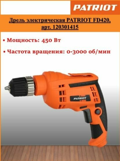 Дрель электрическая PATRIOT FD 420, мощность 450Вт, 3000 об/мин