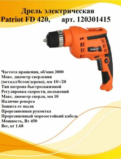 Дрель электрическая PATRIOT FD 420 без удара 120301415