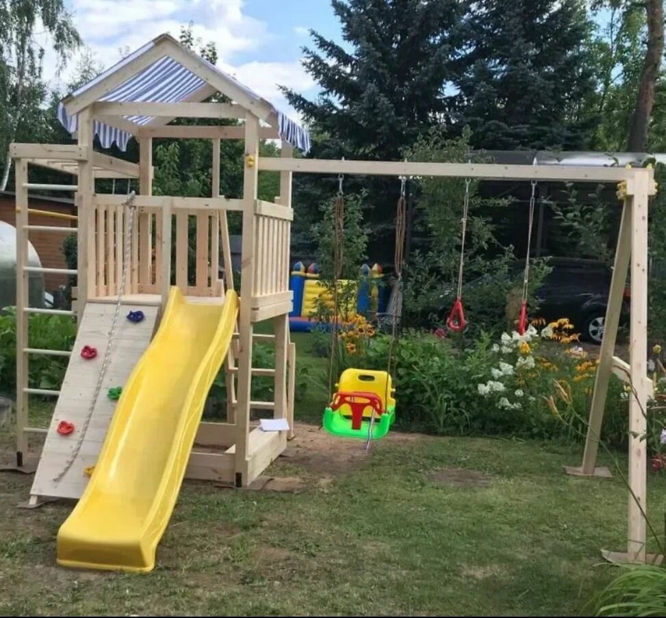 | Плюсы: | Сама по себе площадка очень хоооша. Брали для двоих детей, возрастом 4,5 года. Считаю, что это идеальный вариант для этого возраста. Высота площадки комфортна и безопасна, 1,2 м. В наличии горка, лестница, рукоход, турник, сетка, альпийский подьем и конечно качели. Кстати одни качели поменяли на купленное в Леруа плетеное сиденье, дети остались им очень довольны. |